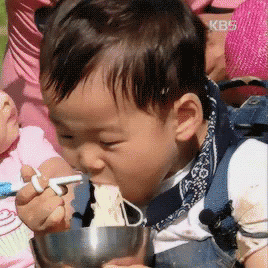 Minguk, a young child, enthusiastically eats a bowl of noodles with chopsticks.