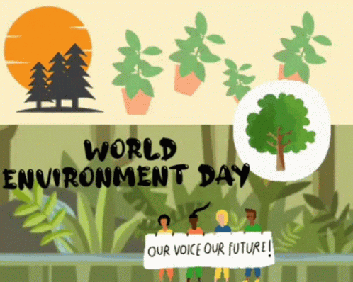 Minha Adheem Study Academy celebrates World Environment Day with a graphic featuring trees, plants, and people holding a sign 'Our Voice Our Future!'