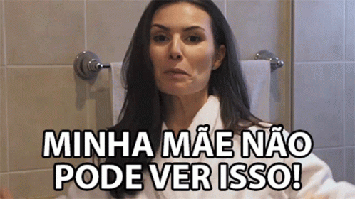 Nathalia Arcuri exclaims "Minha Mae Nao Pode Ver Isso!" (My Mom Can't See This!) in a bathroom, making a 'stop' gesture.