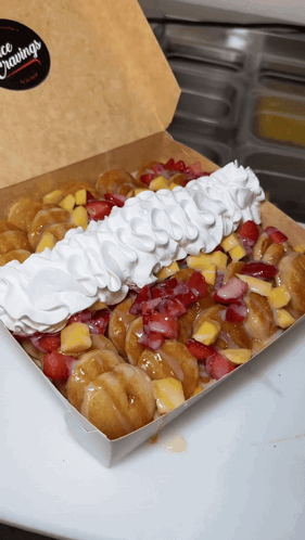 Box of mini pancakes topped with whipped cream, fresh strawberries, and sweet mango.
