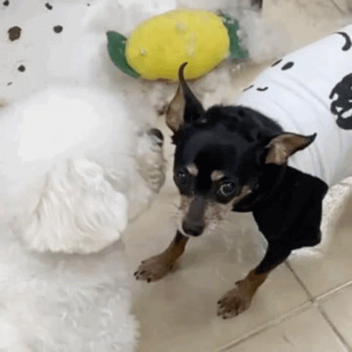 A small black Minipinscher in a shirt barks fiercely and confronts a fluffy white dog in a playful yet aggressive interaction.