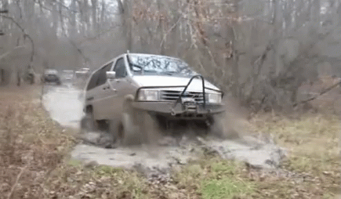 A white minivan drives through deep mud and water in a wooded area, splashing mud everywhere.