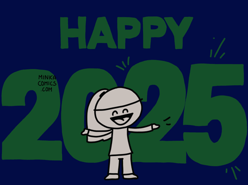 A Minka Comics character celebrates Happy New Year 2025 with sparklers and vibrant animation.