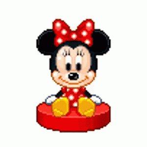 Minnie Mouse, in pixel art form, sits happily on a red base, wearing her iconic polka dot dress and bow.