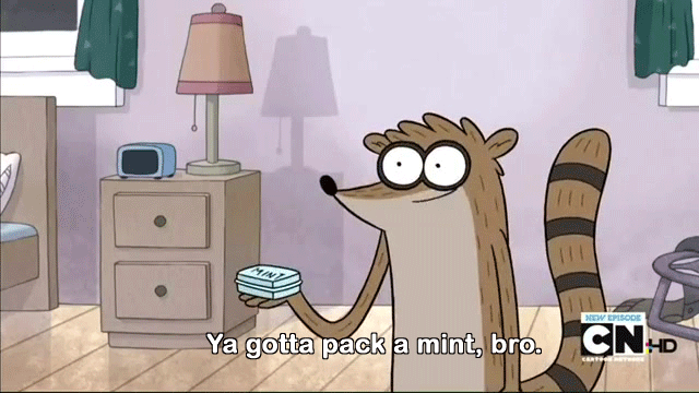 Rigby, the raccoon from Regular Show, holds a box of mints and advises, "Ya gotta pack a mint, bro."
