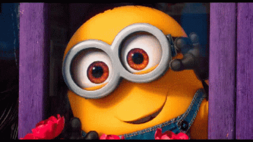 A cute Minion from Despicable Me peeks through an opening with flowers.