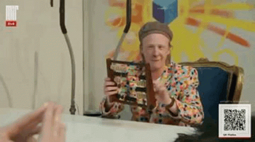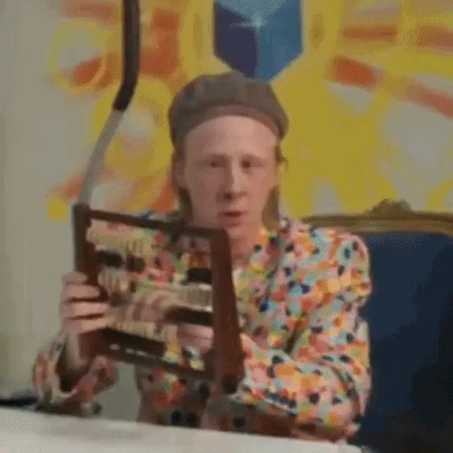 Mír Votjubek in a colorful suit, smiling and interacting with an abacus at a table.