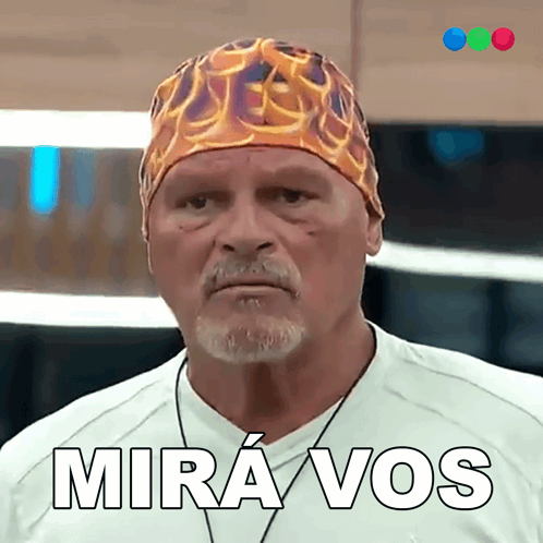 Alfa, from Gran Hermano, reacts with "Mira Vos" while wearing a distinctive flame-patterned bandana.