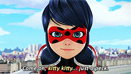 Miraculous Ladybug (Marinette Dupain-Cheng) playfully entices Chat Noir with 'Come on, kitty kitty... just a peck.'