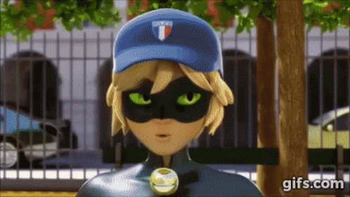 Adrien Agreste, disguised as Cat Noir with a blue hat and mask, waits then runs in Miraculous Ladybug.