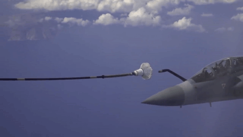 A Hellenic Air Force Mirage 2000-5 fighter jet performs in-flight air refueling over a blue sky.