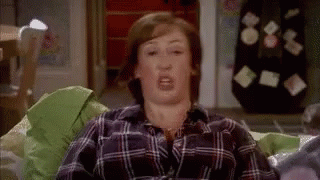 Miranda Hart relaxing on a bed, covered by a duvet, in a plaid shirt, with a funny face pillow.