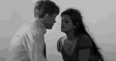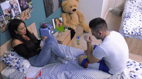 Claudia and Stefan having a serious conversation or argument on a bed in their bedroom, with a teddy bear nearby.