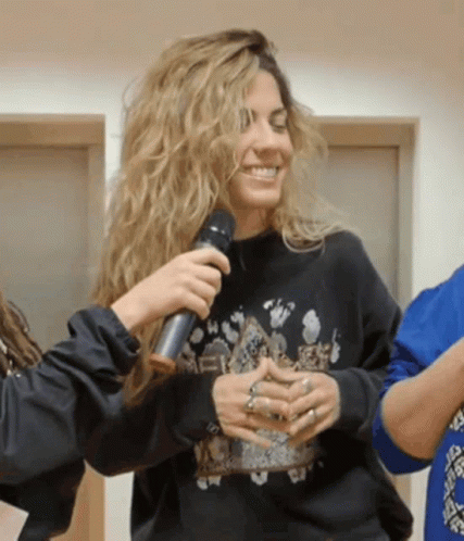 Miriam Rodríguez laughs joyfully while holding a microphone, sharing a moment of fun.
