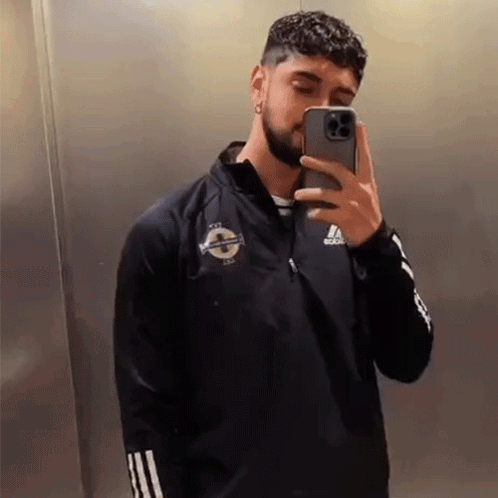 Stefan Peryagh takes a mirror selfie, showcasing his Northern Ireland football jacket.