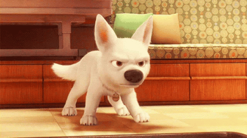 The Mirrorverse Boltqueen, a white dog, stands with an angry, determined expression in a kitchen setting.