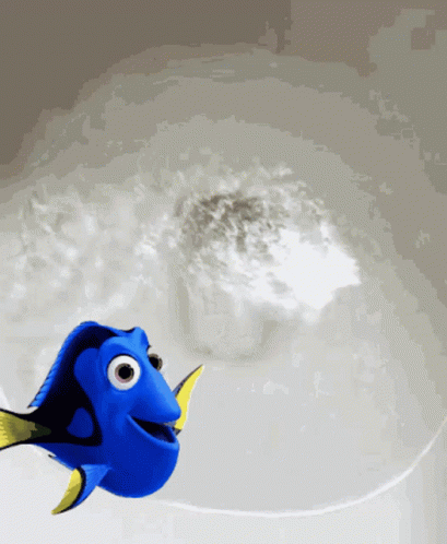 Dory, the blue tang fish, is seen spinning and getting flushed down a toilet in this animated clip.