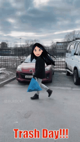 Mulan from Mirrorverse humorously disposes of a trash bag, performing a flip into the dumpster on trash day.