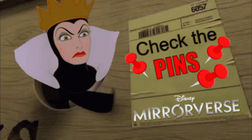 Close-up of Mirrorverse pins featuring the Evil Queen and Maleficent, displayed with a 'Check The Pins' sign.