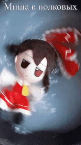 A Reimu Hakurei fumo plush floating in milky water, with Russian text 'Misha in the regimental' overlaid.