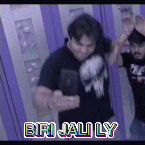 Mishtersami Ashish and another man dance energetically with meme captions 'BIRI JALI LY' and 'DI DI DINGDONG' on screen.