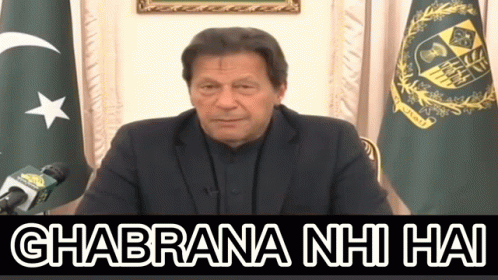 Imran Khan delivering his famous 'Ghabrana Nahi Hai' message, seated in front of microphones with flags behind him.