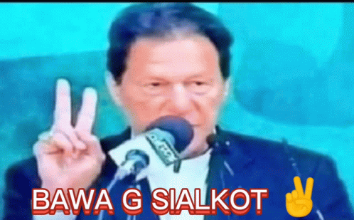 Imran Khan PTI gives a peace sign at a rally in Sialkot, with 'Bawa G Sialkot' visible.