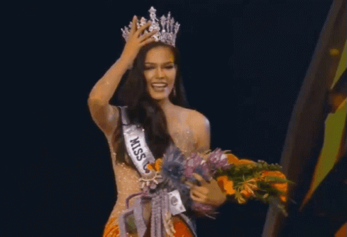 Miss Universe Thailand winner Paweensuda (Fahsai) proudly wears her crown and sash, holding a bouquet of flowers on stage.