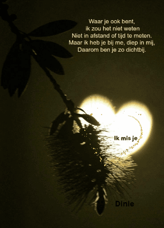 Dinie's heartfelt poem about missing someone, with a plant and a heart-shaped light effect.