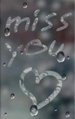 Water droplets form 'Miss You' and a heart on a glass surface, conveying a heartfelt message.