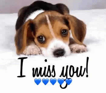 An adorable beagle puppy lies down, looking sweetly at the camera, accompanied by an 'I miss you!' message.