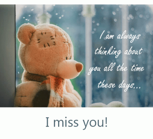 A teddy bear by a window, expressing feelings of missing someone with an emotional message.