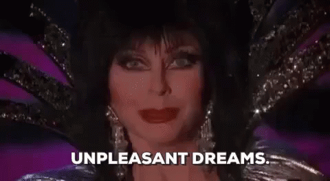 Elvira, Mistress Of The Dark, smiles and winks while saying her iconic line, 'Unpleasant Dreams.'