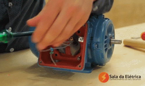 A person connects wires on an electric motor, featuring the Sala da Elétrica logo.