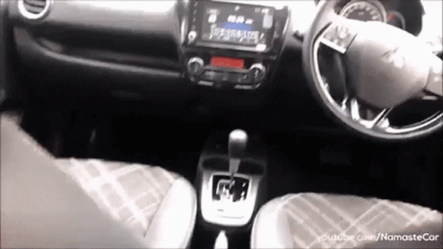 Detailed view of the Mitsubishi Mirage car interior, showcasing the dashboard, steering wheel, and gear shift.
