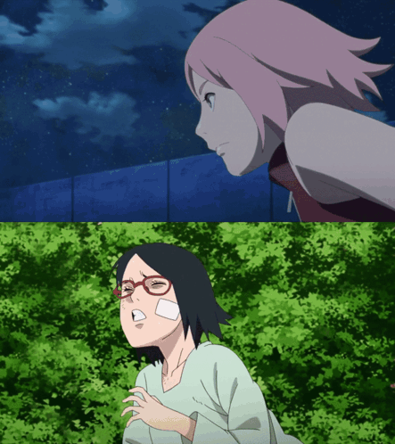 Sasuke carries Sakura, and Mitsuki carries Sarada, both injured, in this anime scene from Boruto.