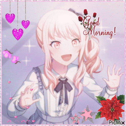 Mizuki Akiyama from Project Sekai wishing a cheerful good morning with hearts and stars.