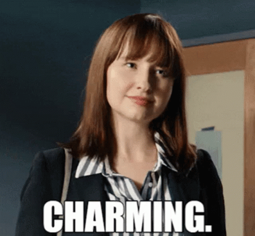 Mary Kate Wiles looks charming, wearing a striped shirt and blazer, with the word 'Charming' displayed on screen.