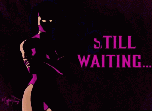 Mileena from Mortal Kombat 11 stands in shadow, with the text 'STILL WAITING...' displayed prominently.