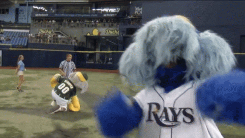 Tampa Bay Rays mascot Raymond celebrates a victory on the baseball field, proudly displaying a championship belt.
