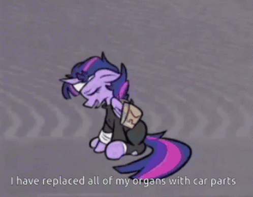 A cartoon pony and another character with the caption 'I have replaced all of my organs with car parts'.