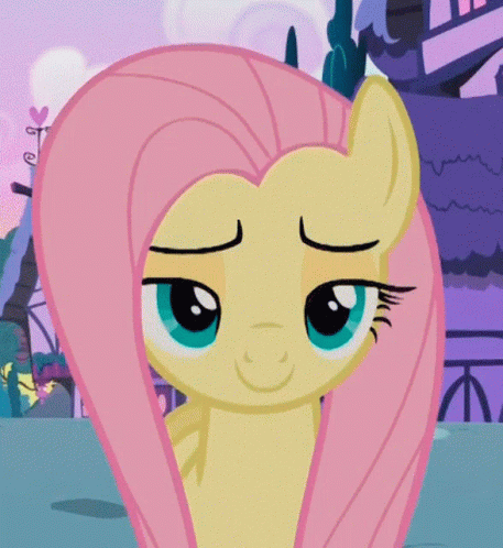 Fluttershy from My Little Pony winks and smiles shyly, then gracefully exits the scene.