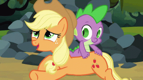 Spike the dragon relaxing on Applejack's back in My Little Pony, enjoying a moment of peace.
