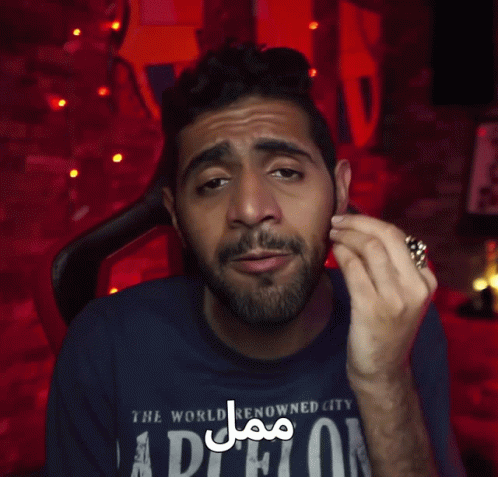 Abdulla Alnoaimi looking bored and disappointed, with the Arabic caption 'ممل' (Boring).