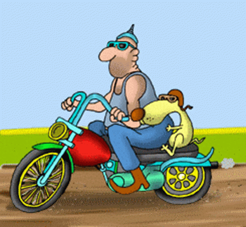 Cartoon characters Mmo and Timoto riding a motorcycle together on an adventure.