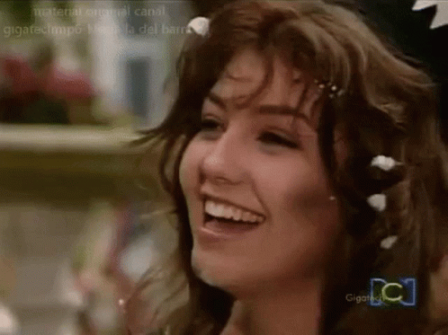 Maria La Del Barrio smiles brightly in a close-up shot, with flowers in her hair.