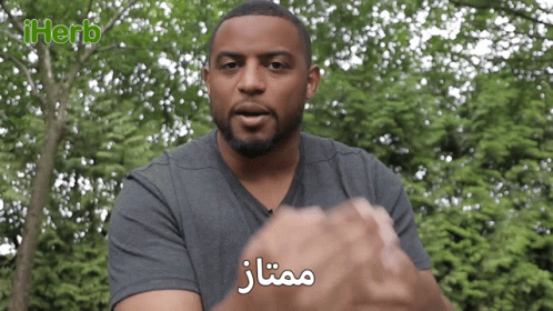 Fahad Sal speaks, saying "Excellent" (ممتاز) in front of trees, with the iHerb logo visible.