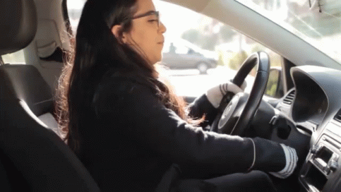 Iman Biti happily driving a car, wearing glasses and smiling with confetti falling around her.