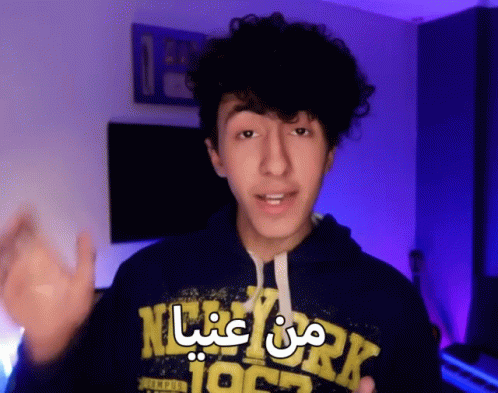 A young man in a New York hoodie speaks the Arabic phrase 'من عنيا' (With my pleasure).