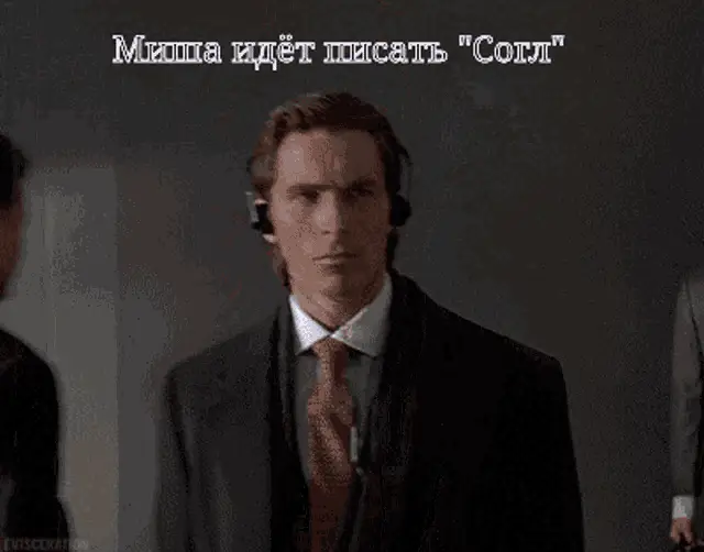 Two men in sunglasses and ties, including Misha, express an opinion in a classroom setting.